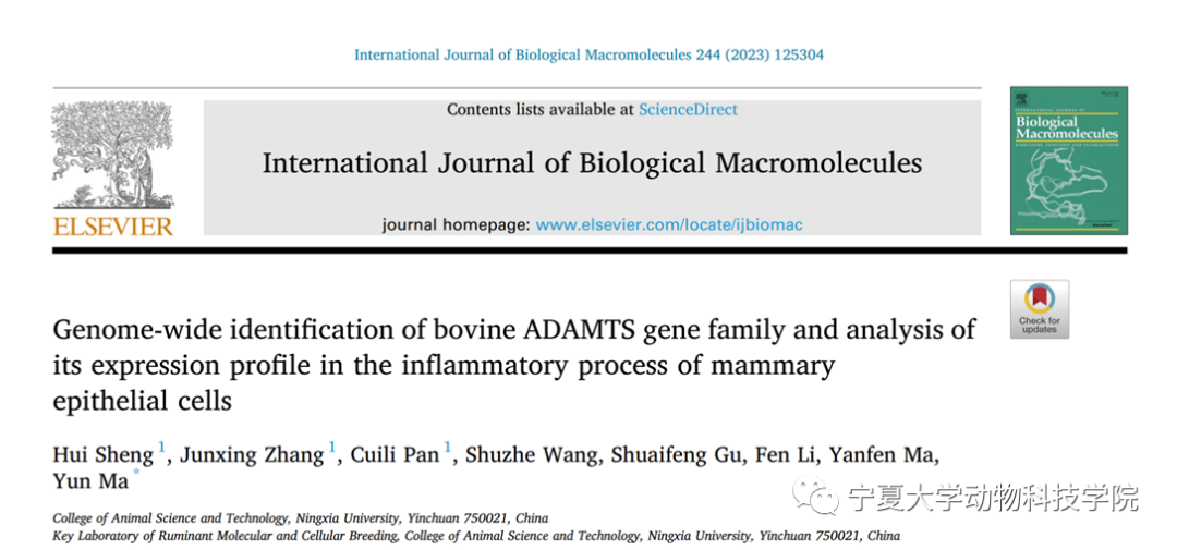 近期,百家乐在线马云教授领衔的宁夏优势特色牛产业科技创新团队在国际知名学术期刊《International Journal of Biological Macromolecules》(IF=8.2,中科院1区top)发表题为“Genome-wide identification of bovine ADAMTS gene family and analysis of its expression profile in the inflammatory process of mammary epithelial cells”的研究论文。