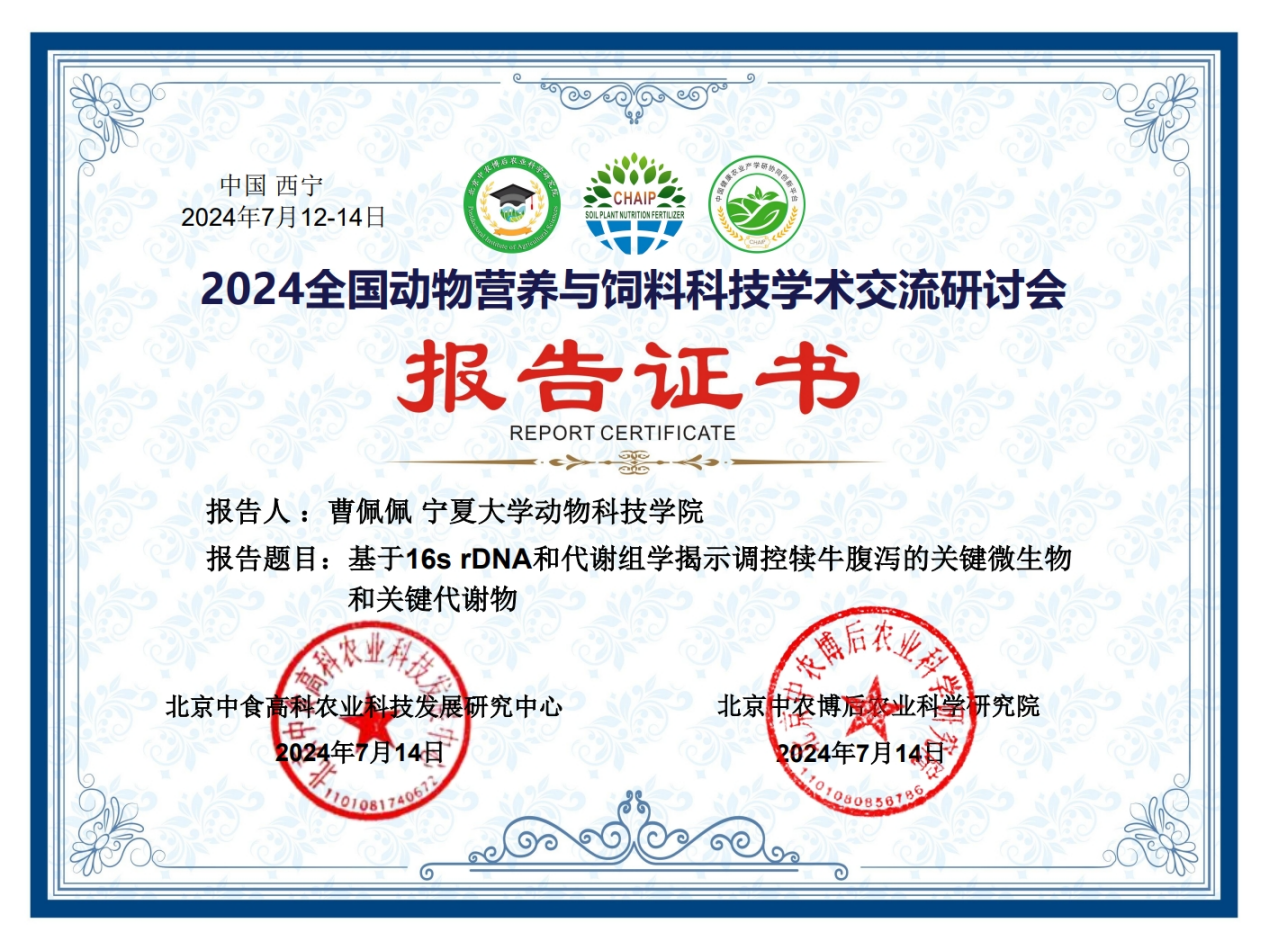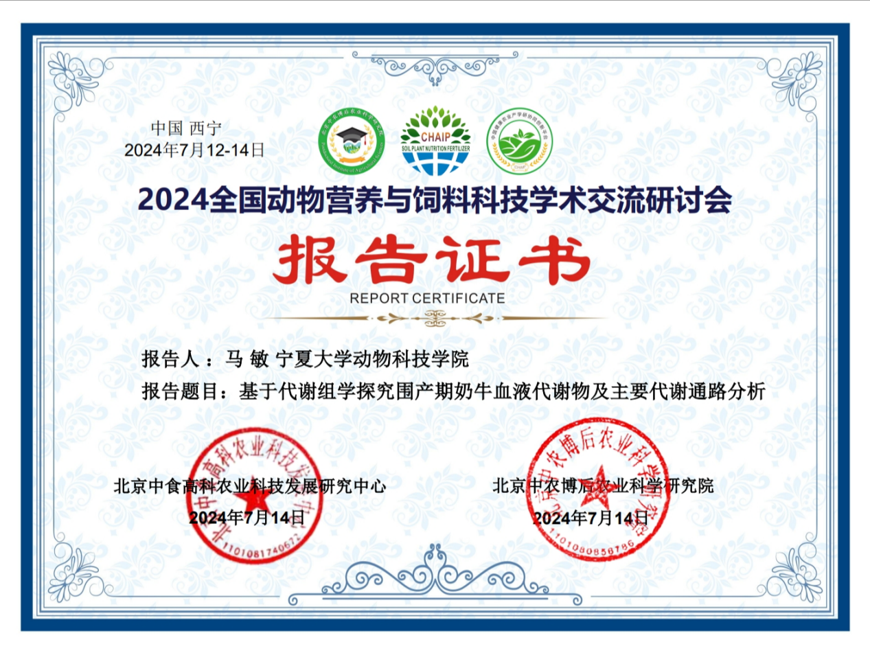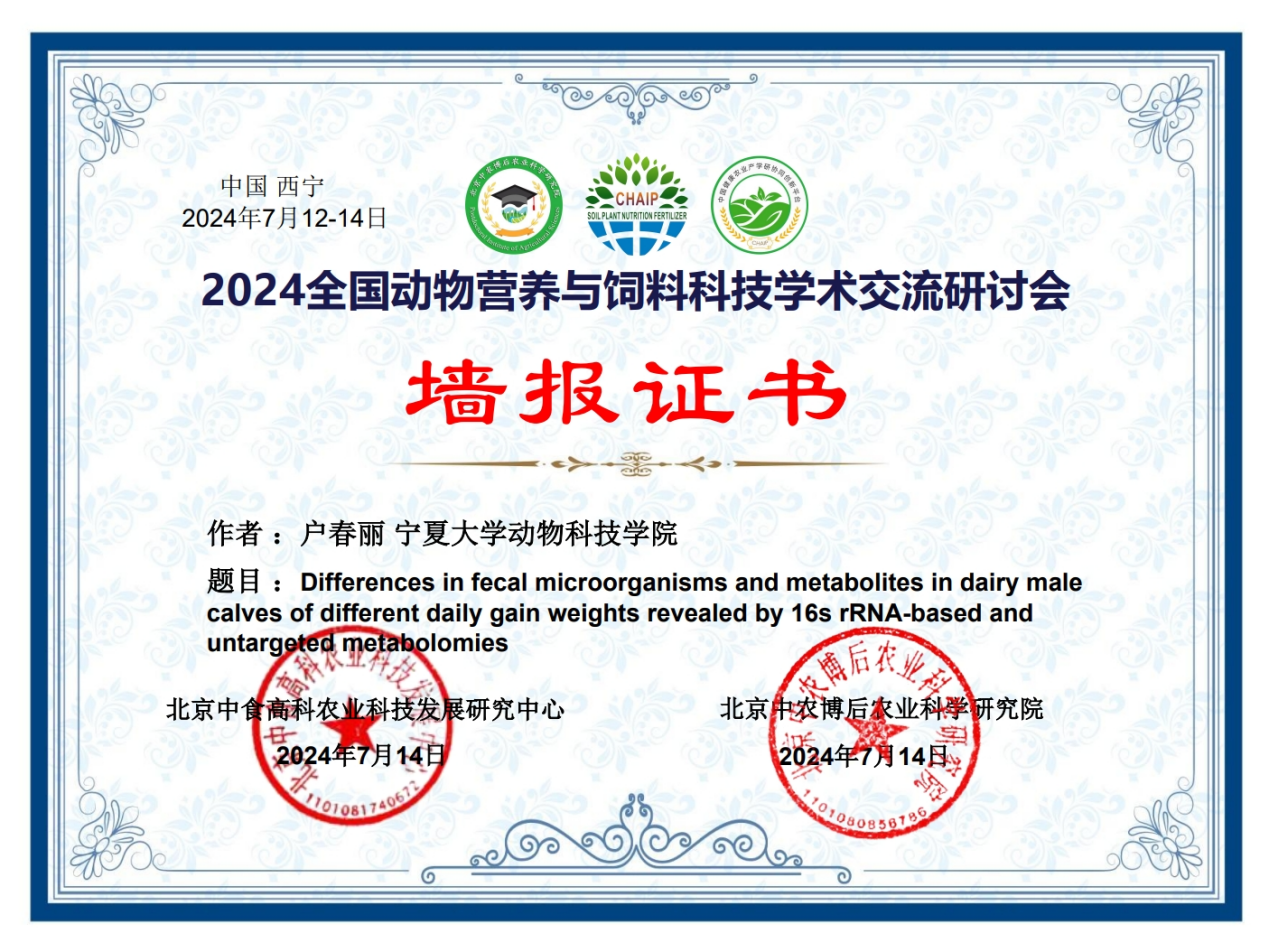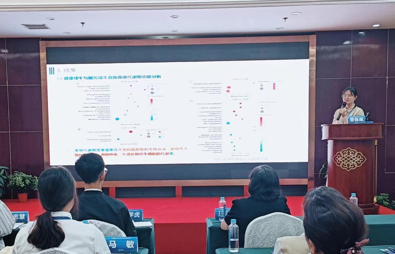 等多所高校的业界著名专家、企业家、青年才俊和博硕士研究生针对奶牛、肉牛、家禽、猪、羊等动物的肠道健康、营养调控、肉质评定等方面进行了汇报交流。百家乐在线马燕芬研究员指导的博士研究生马学虎以《EGCG缓解氧化损伤奶牛乳腺上皮细胞的研究》为题作口头报告、硕士研究生曹佩佩以《基于16s rDNA和代谢组学揭示调控犊牛腹泻的关键微生物和关键代谢物》为题作口头报告、硕士研究生宋忠慧以《高低日增重奶公犊血浆差异代谢物分析研究》为题作口头报告、硕士研究生马敏以《基于代谢组学探究围产期奶牛血液代谢物及主要代谢通路分析》为题作口头报告、博士研究生户春丽以《Differences in fecal microorganisms and metabolites in dairy male calves of different daily gain weights revealed by 16s rRNA-based and untargeted metabolomies》为题作墙报展示。通过参加本次学术讨论会,不仅加强了团队师生的学习交流能力,又对当前我国动物营养与饲料科学领域热点有了更为深入的了解。为百家乐在线与国内知名学者提供了一个交流平台,并为人才培养提供了新的策略,更为团队今后科研方向提供了新的思路。