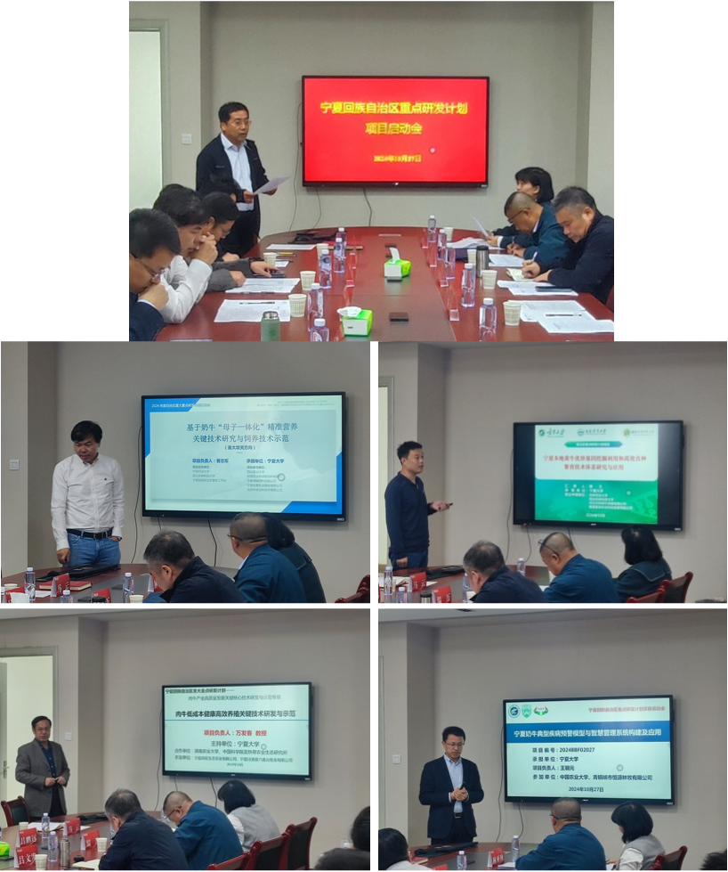 主持的2024年宁夏回族自治区重点研发计划“基于奶牛“母子一体化”精准营养关键技术研究与饲养技术示范(重大)”、“宁夏本地黄牛优异基因挖掘利用和高效良种繁育技术体系研究与应用(重大)”、“肉牛低成本健康高效养殖关键技术研发与示范(重大)”和“宁夏奶牛典型疾病预警模型与智慧管理系统构建及应用(重点)”四个项目联合启动会在百家乐在线顺利召开。